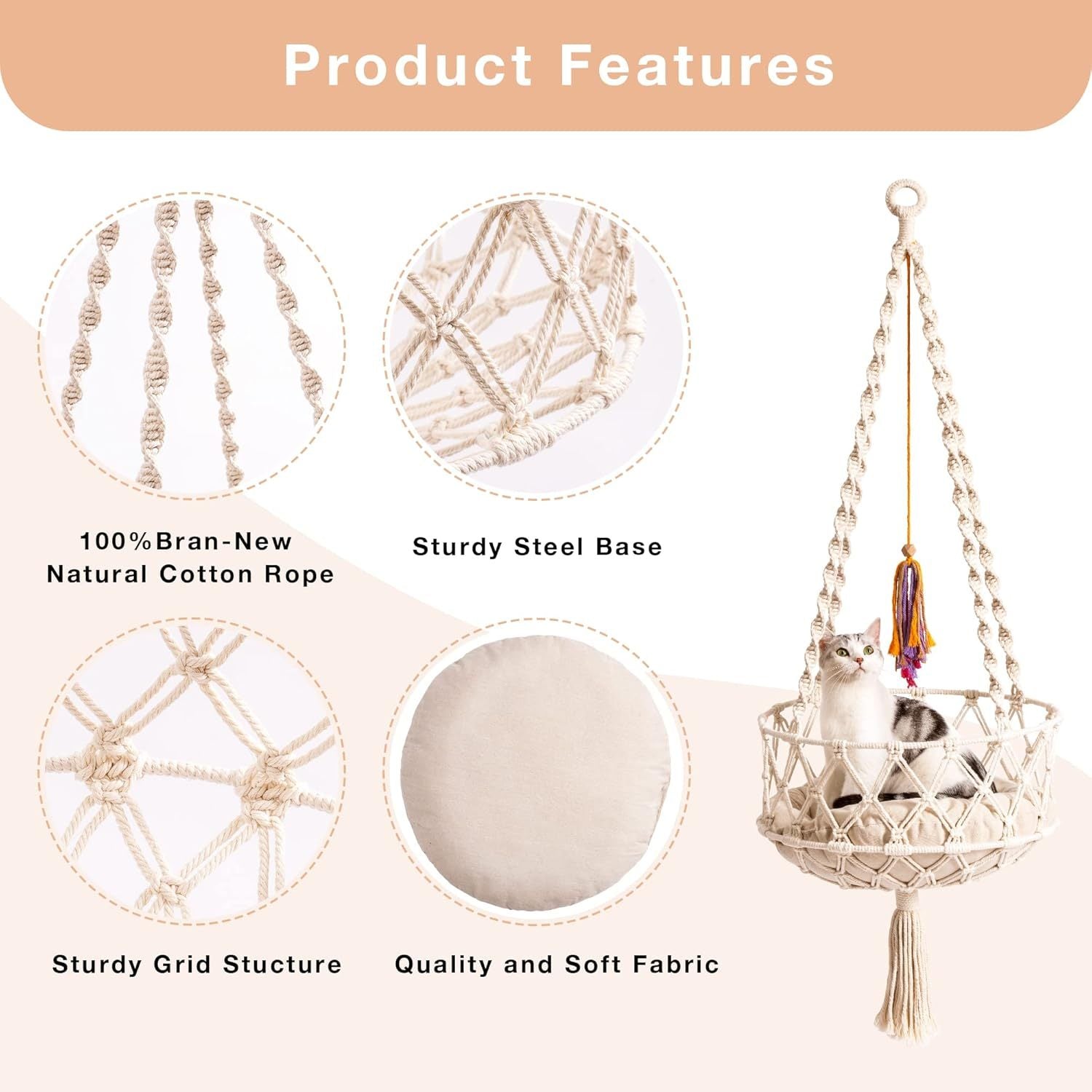 This cat swing offers a cozy, stylish spot for your feline to play and relax. It features a large, washable cotton pad that's soft and easy to clean. Made with sturdy cotton rope and a metal frame, it’s secure and safe for cats up to 7.5 kg. The elegant design adds charm to any room, and it’s simple to hang and assemble. Perfect for cats who love a high perch, this swing combines comfort, durability, and style for your pet's enjoyment.