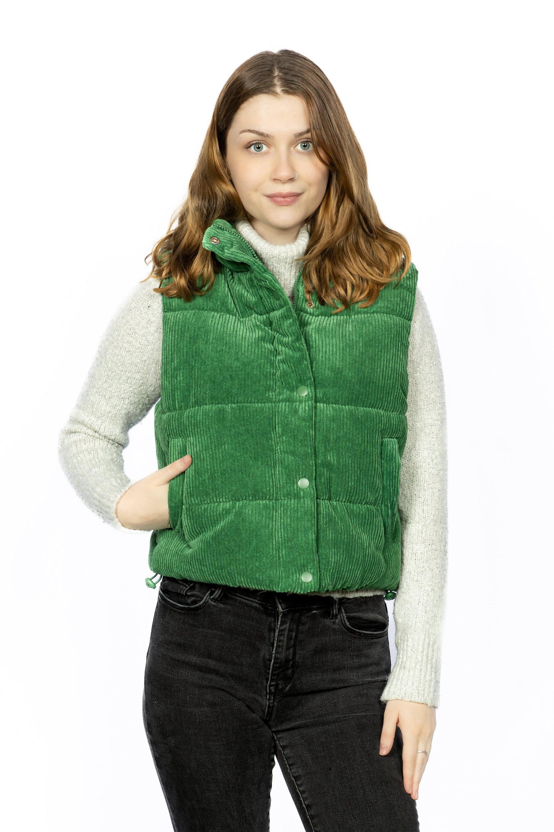 This cropped corduroy puffer vest combines warmth, style, and comfort for fall and winter. Featuring a modern cropped silhouette and rich corduroy texture, it layers easily over sweaters and dresses. Its puffer design provides insulation without bulk, while the high collar, zip-up closure, snap buttons, and adjustable toggle waist ensure a tailored fit. Crafted from durable polyester and nylon, this vest offers versatile, cozy-chic layering that enhances any cold-weather outfit.